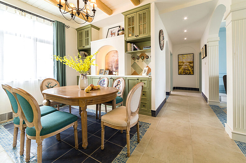 本案中的130平米的三居室整体采用了地中海风格装修,并在清爽惬意的空间氛围中融入了田园风格的清新自然感,在色彩的选择上也尽量的以清爽的蓝色和富有活力的明黄色为主,并在餐厅中运用了象征着森林的墨绿色,为空间带来静谧之感的同时也增添了几分自然的气息。同风格案例:更多>>