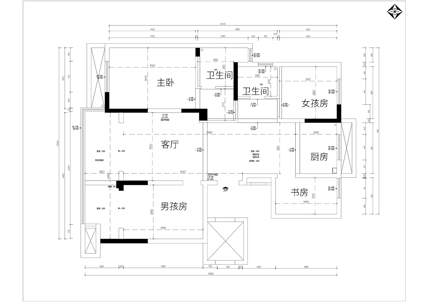1、将两个卫生间重新分配,改成三个独立的功能区,满足了一家四口淋浴、坐便、洗漱的正常使用